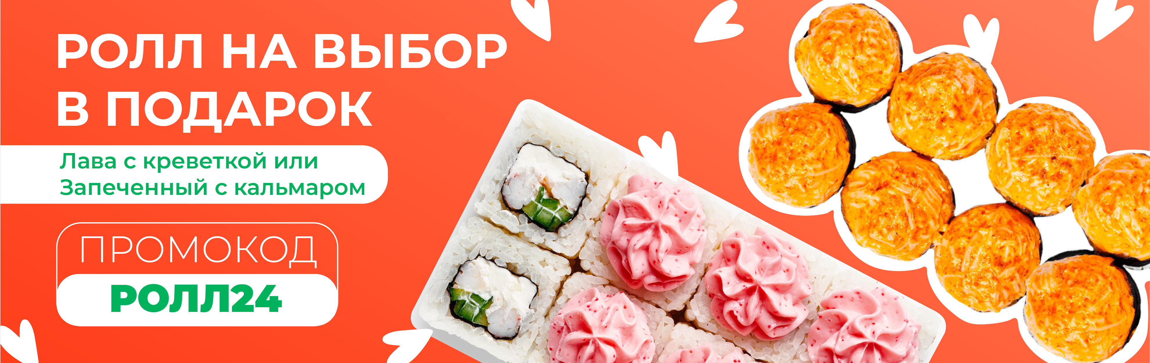 — используй промокод РОЛЛ24 в специальном окошке и забирай ролл на выбор - ЛАВУ С КРЕВЕТКОЙ или ЗАПЕЧЕНЫЙ С КАЛЬМАРОМ!