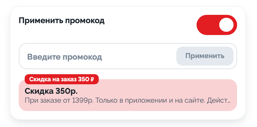 Полные условия: акция не суммируется с другими акциями и скидками, не распространяется на самовывоз, промокодом ССС350 можно воспользоваться только, если сумма заказа больше 1399 рублей (до использования промокода). Ознакомиться с картой и условиями доставки можно по ссылке.