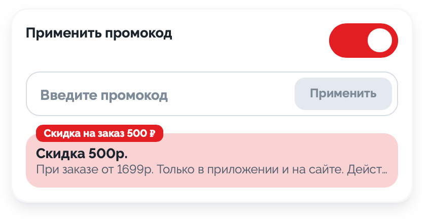 Полные условия: акция не суммируется с другими акциями и скидками, не распространяется на самовывоз, промокодом ССС500 можно воспользоваться только, если сумма заказа больше 1699 рублей (до использования промокода). Ознакомиться с картой и условиями доставки можно по ссылке.
