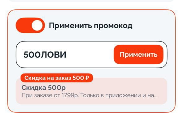 Полные условия: акция не суммируется с другими акциями и скидками, не распространяется на самовывоз, промокодом 500ЛОВИ можно воспользоваться только, если сумма заказа больше 1799 рублей (до использования промокода). Ознакомиться с картой и условиями доставки можно по ссылке.