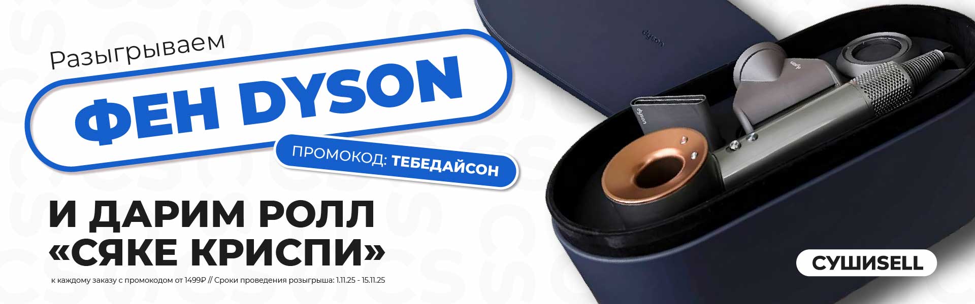 Делай заказ, получай любимый ролл «Сяке криспи» в подарок от 1499 руб. и возможность выиграть фен Dyson! Все очень просто: