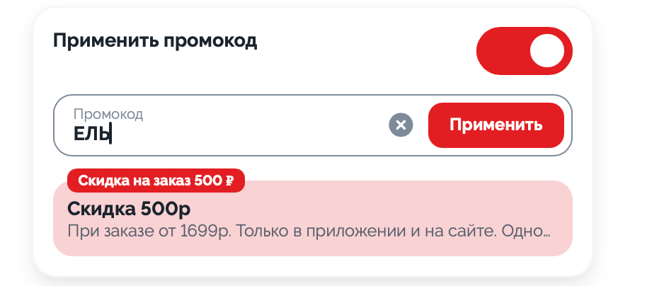 Полные условия: акция не суммируется с другими акциями и скидками, не распространяется на самовывоз, промокодом ЕЛЬ можно воспользоваться только, если сумма заказа больше 1699 рублей (до использования промокода). Ознакомиться с картой и условиями доставки можно по ссылке.