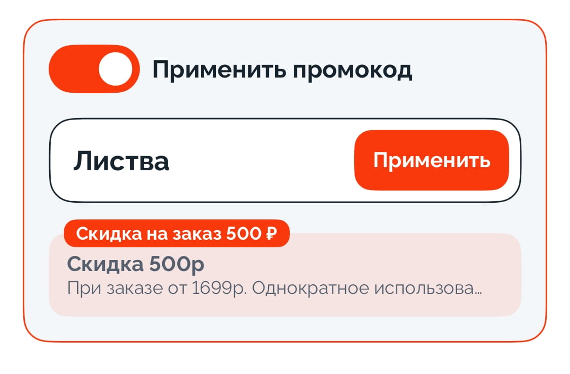 — используй промокод ЛИСТВА в специальном окошке и получи скидку 500 рублей