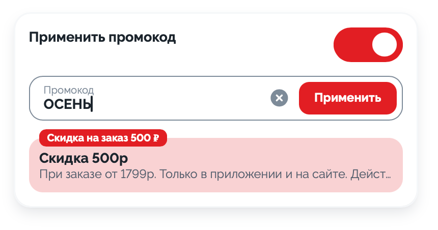 Полные условия: акция не суммируется с другими акциями и скидками, не распространяется на самовывоз, промокодом ОСЕНЬ можно воспользоваться только, если сумма заказа больше 1799 рублей (до использования промокода). Ознакомиться с картой и условиями доставки можно по ссылке.